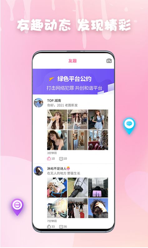 2、分享自己的生活到朋友圈互相深入了解,即时闲聊生活遇到的开心事情。