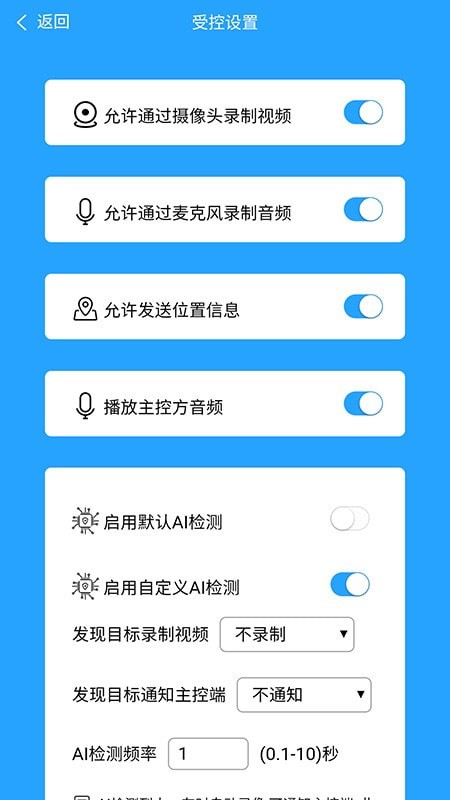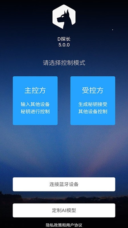 D探长APP安装后生成秘钥,可接受另一台手机远程控制,实现视频监控、物联网硬件控制等功能。 还可以使用AI功能,打造智能设备。