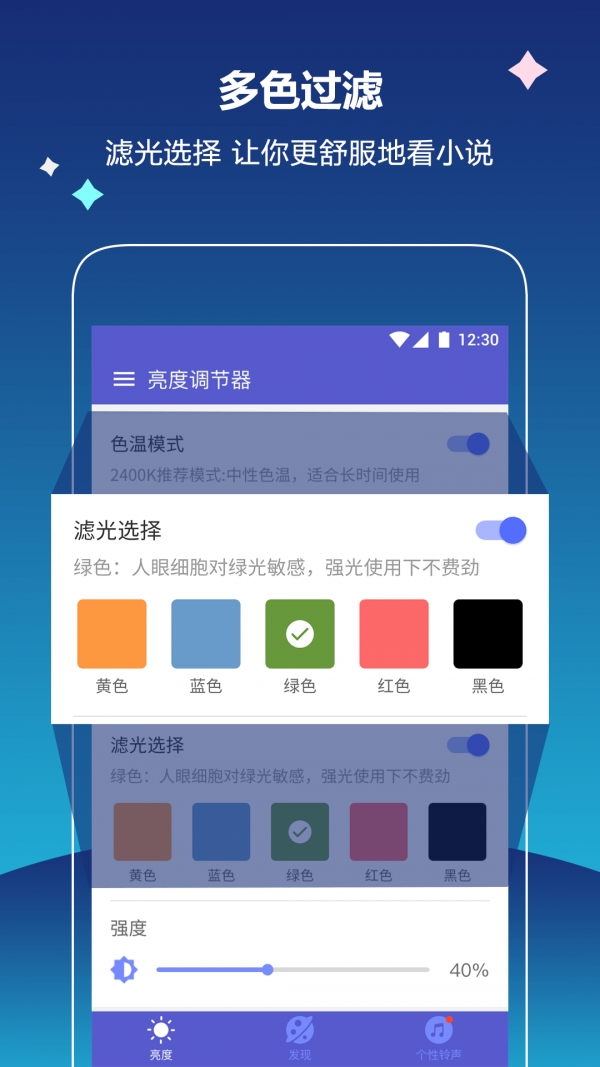 读书亮度调节器是一款屏幕调节app,通过读书亮度调节器你可以便捷的调节你的屏幕亮度、色调等信息,从而更好的保护眼睛。