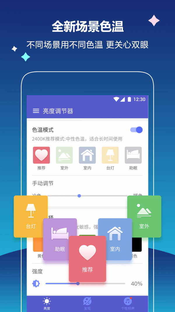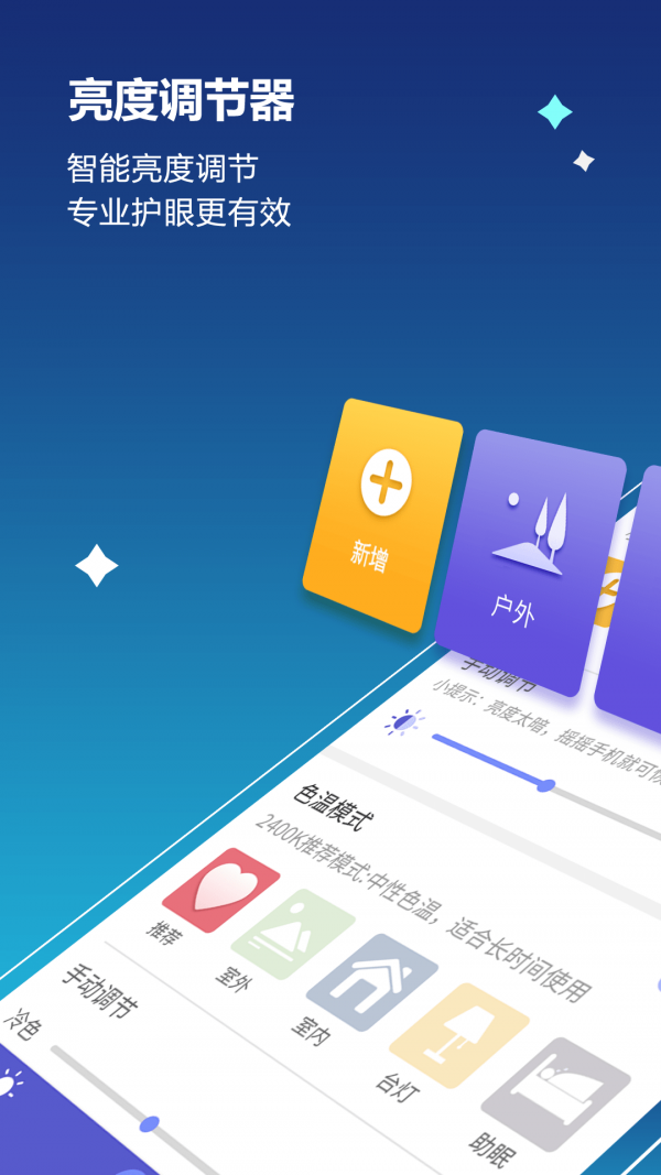 系统自带的亮度调节,黑暗中,刺眼的屏幕仍然让你眼睛疲劳,影响枕边人休息,4种模式,无限降低屏幕亮度,总有一个亮度适合你,夜晚微信、陌陌、购物、阅读、被窝必备!呵护您的眼睛,节省手机用电,就这么简单。