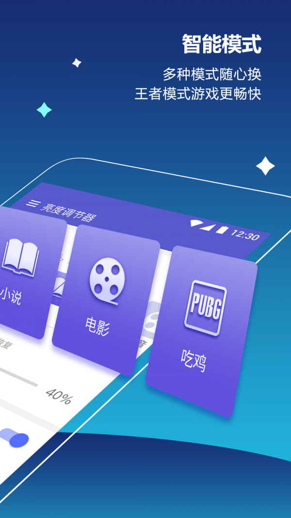 提供5%到100%任意亮度调节,4种智能模式,滤光护眼模式,状态栏调节功能,提升待机时长40%,扩展系统能力,让亮度调节更加专业,操作更加简单!摩嘎科技,专注提供简单,好用,接地气的好工具!