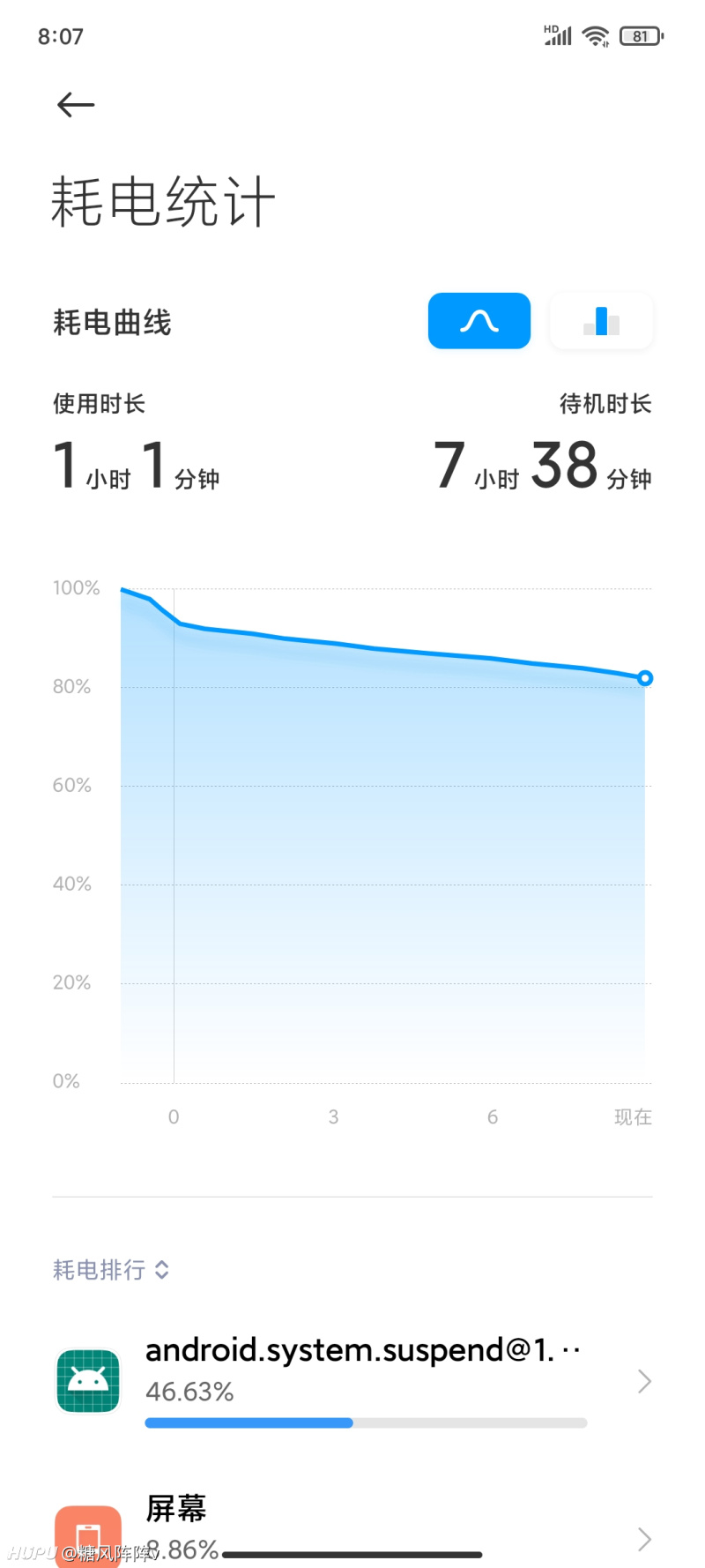 从这些数据中可以看到,微信在后台偷跑,但也正常,并不是主要的耗电来源,最主要的就是那个安卓系统服务什么的,稳稳的排在耗电排行榜第一位。