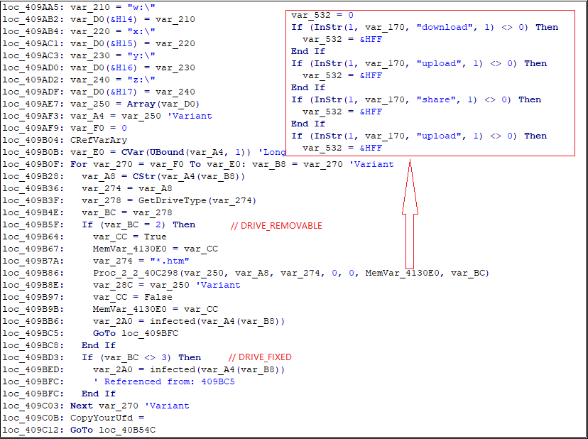 第二种是通过自我复制到可移动设备,或者包含”download”,”upload“,”share”等共享文件目录进行传播,这种方式虽然看似简单,却也是最行之有效的传播方式。