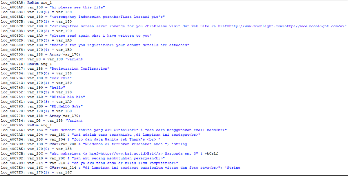 首先我们看看MoonLight,该蠕虫的传播方式分为两种,第一种是通过电子邮件进行传播,它会搜集中毒用户的邮箱联系人,并以当前用户的身份给这些联系人发送携带MoonLight蠕虫的电子邮件,以此传播自身,伪造电子邮件的部分代码如下: